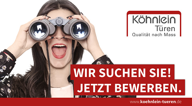 In den Bereichen Vertrieb, Holztechnik, Marketing und EDV hat der Türenhersteller Köhnlein einen wachsenden Bedarf an qualifizierten Fachkräften. In einem dynamischen, innovativen Team können sich Bewerber auf eigenverantwortliche und vielfältige Aufgaben freuen. Die Mitarbeiter profitieren von einer familiär geführten Unternehmenskultur, Weiterbildungsmöglichkeiten, leistungsgerechter Bezahlung sowie weiteren attraktiven Rahmenbedingungen. Das solide, langfristig orientierte Familienunternehmen setzt auch auf die Ausbildung von Nachwuchskräften, mit dem Ziel einer Übernahme der Auszubildenden.