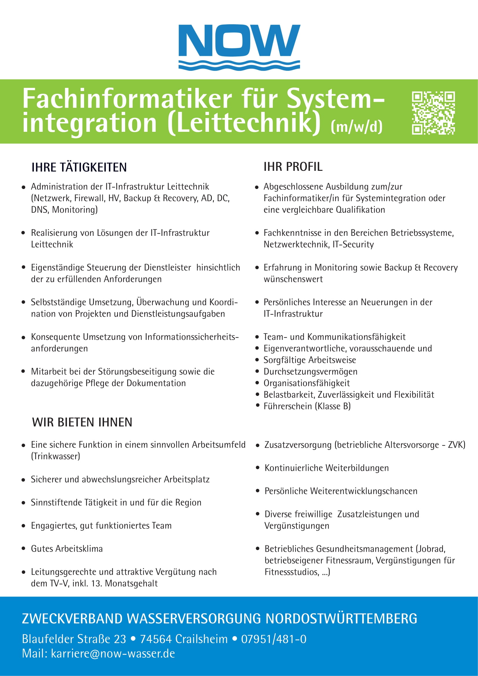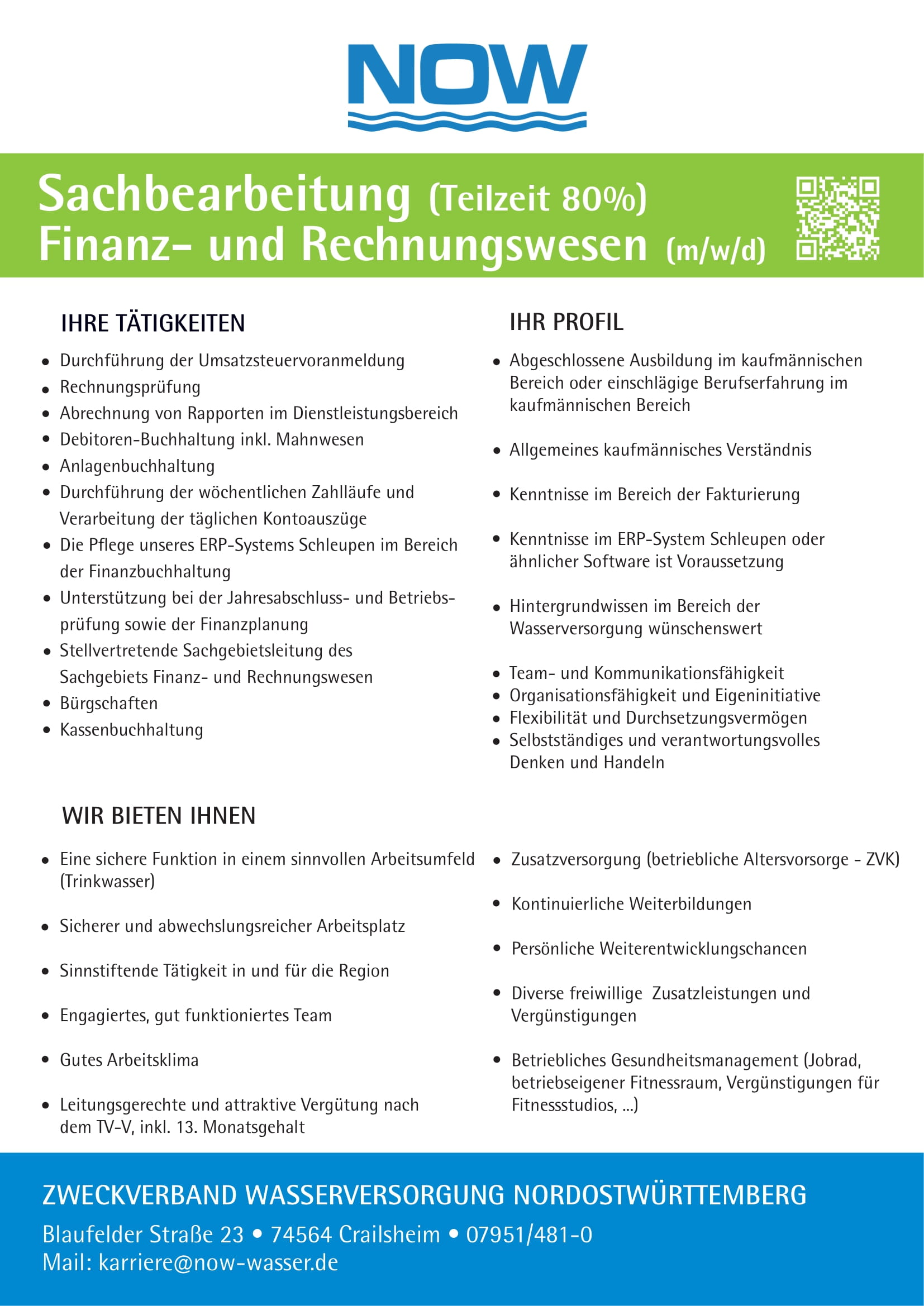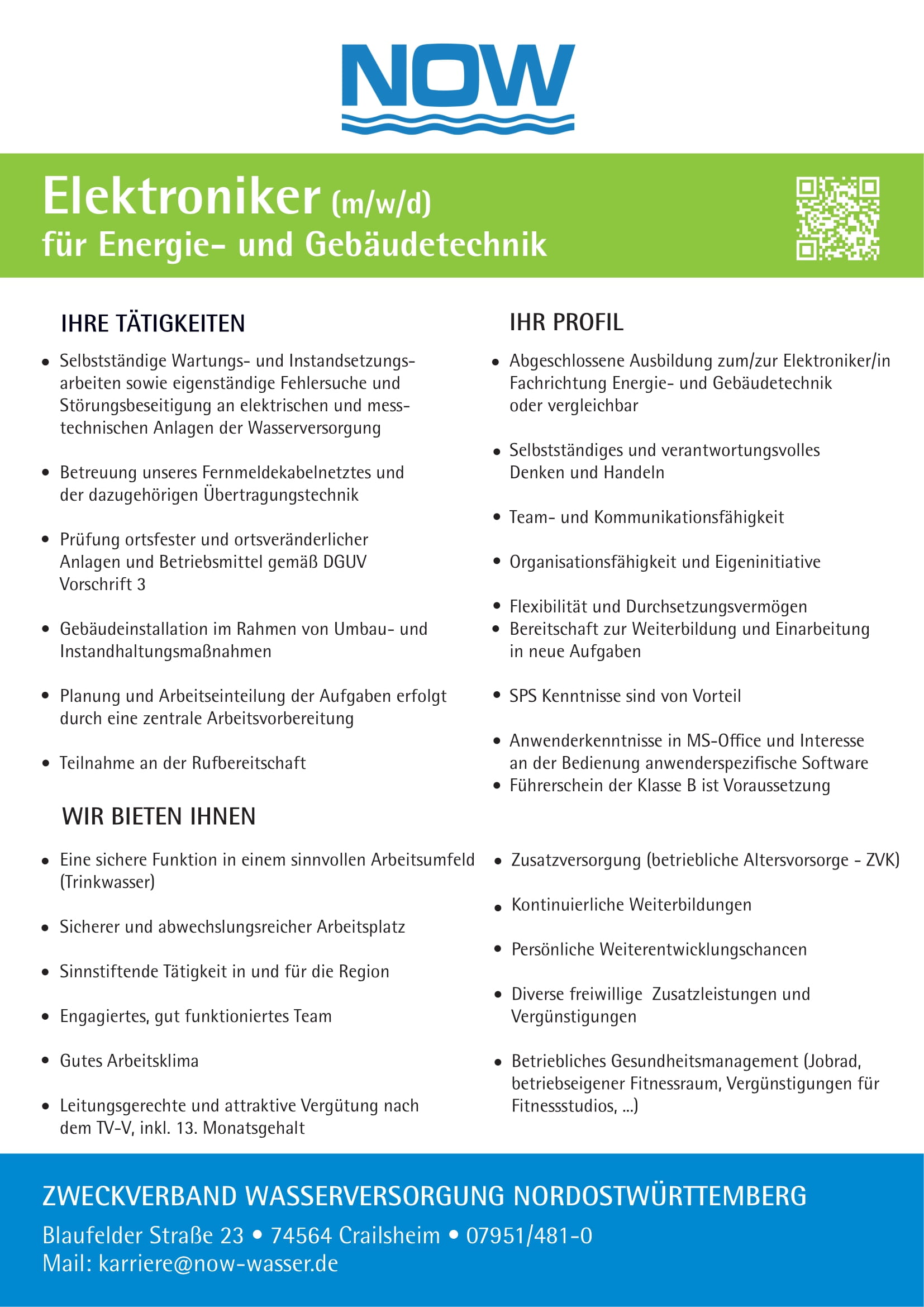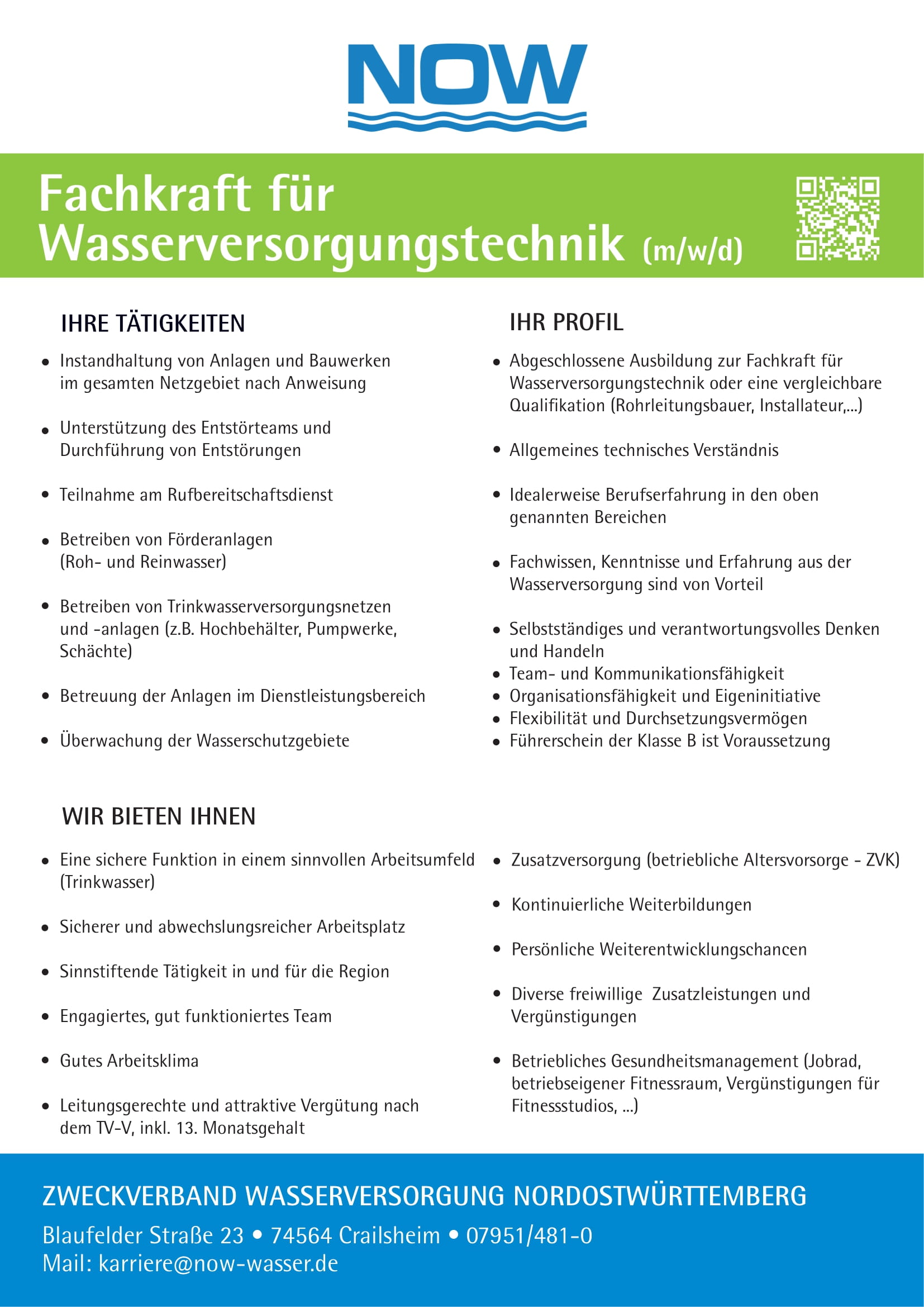 Kontinuierlich sucht die NOW engagierte Wasserliebhaberinnen und Wasserliebhaber zur Verstärkung ihres Teams, die sich mit Leidenschaft in den Dienst unseres Trinkwassers stellen. Sei dabei und sorge ab dem ersten Tag mit uns für das wichtigste Lebensmittel Nr. 1 – Wasser.